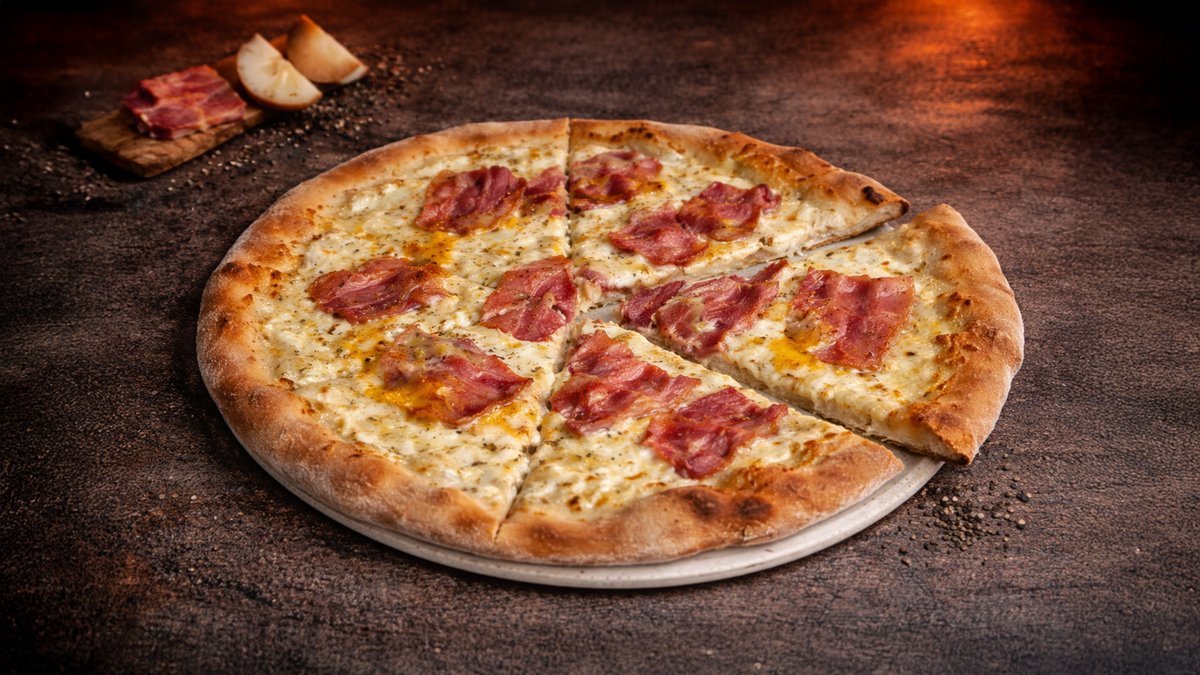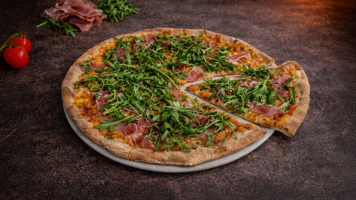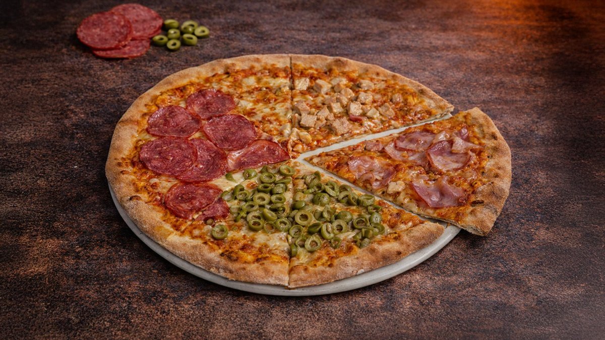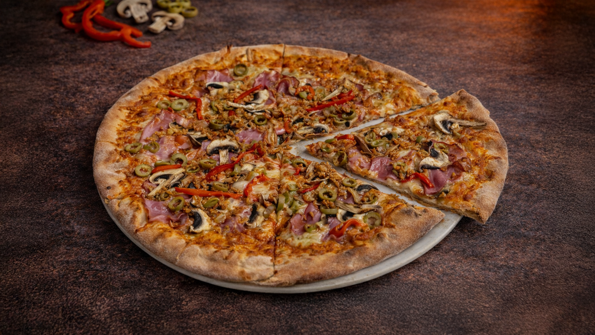 Tomato, mozzarella, anglická slanina, paprika, žampiony, zelené olivy, cibule, chilli, česnek Tomato, mozzarella, bacon, pepper,, mushrooms, green olives, onion, chilli, garlic