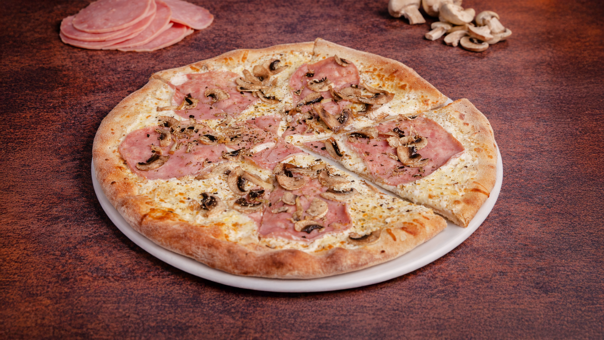 Smetana, mozzarella, šunka, žampiony Cream, mozzarella, ham, mushrooms