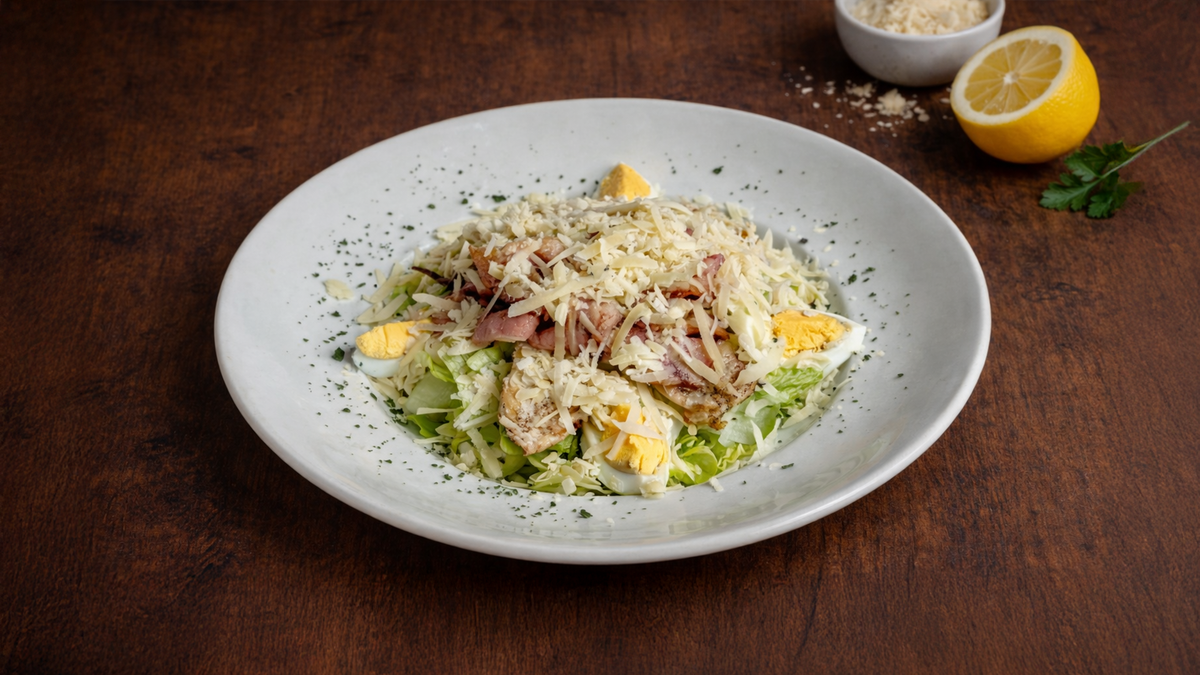 Ledový salát, dresing, kuřecí maso, opečená slanina, vejce, parmazán Ice lettuce, cheese dressing, chicken meat, fried bacon, egg, parmesan