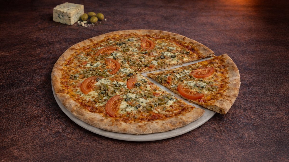 Tomato, mozzarella, niva, zelené olivy, rajče, cibule, oregano Tomatoes, mozzarella, blue cheese, green olives, onion, oregano