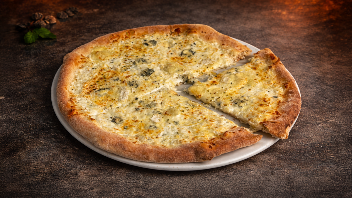 Smetana, mozzarella, niva, hermelín, bazalka, parmazán Cream, mozzarella, blue chesse, camembert, parmesan cheese, basil