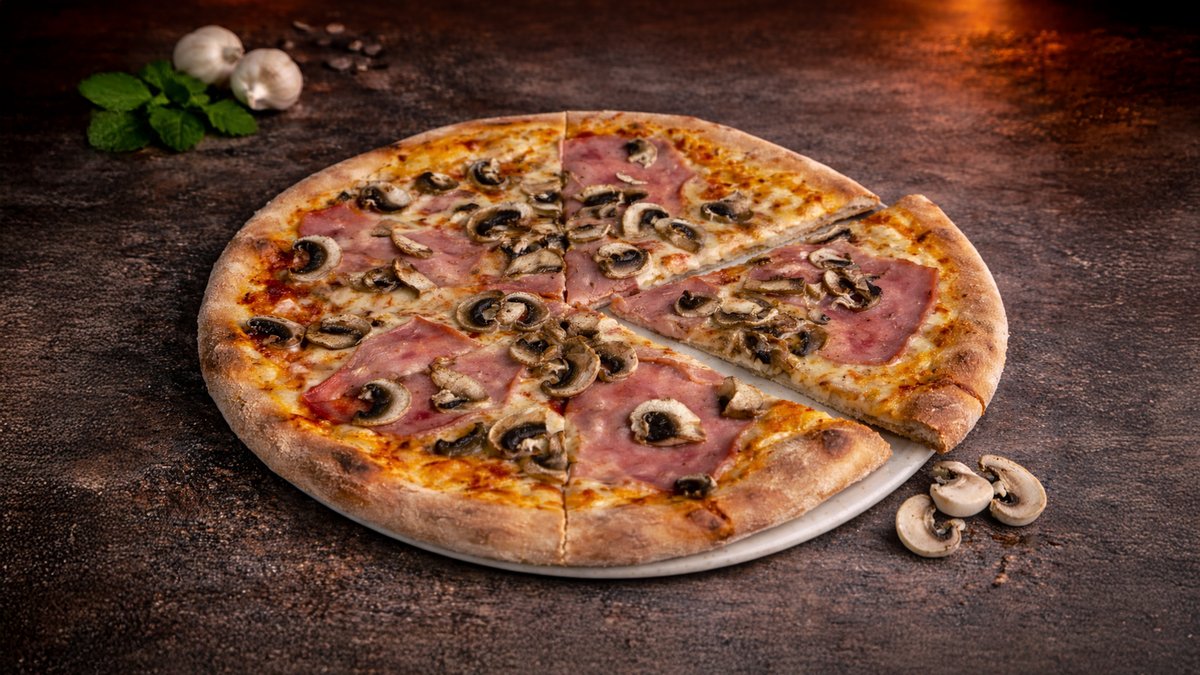 Tomato, mozzarella, šunka, žampiony Tomatoes, mozzarella, ham, mushrooms