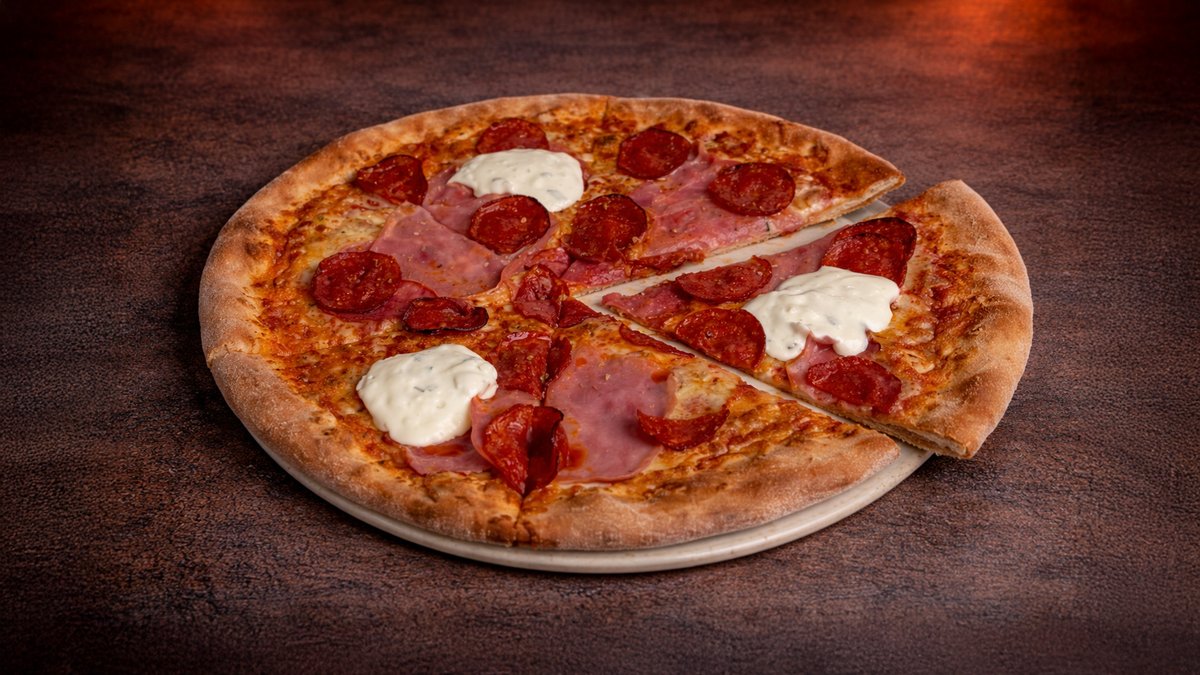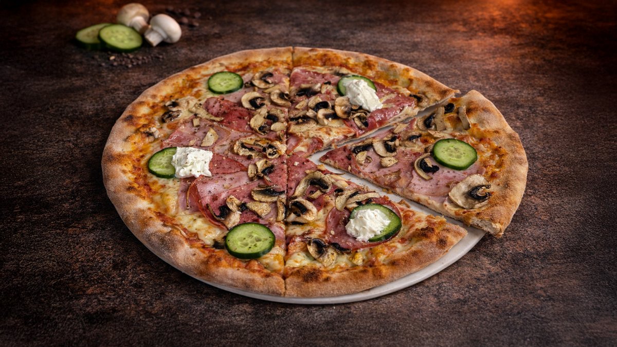 Tomato, mozzarella, šunka, slanina, salám, žampiony, okurky, zakysaná smetana Tomatoes, mozzarella, ham, bacon, salami, mushrooms, cucumer, cream