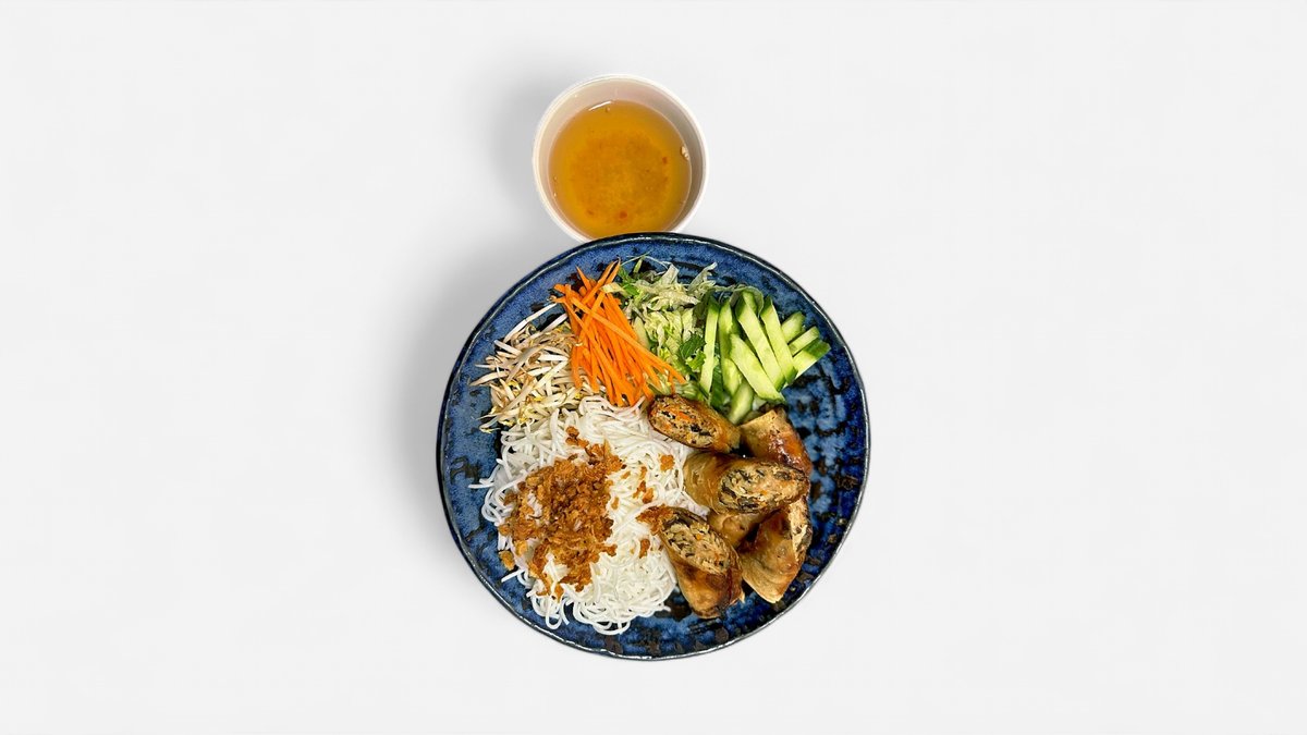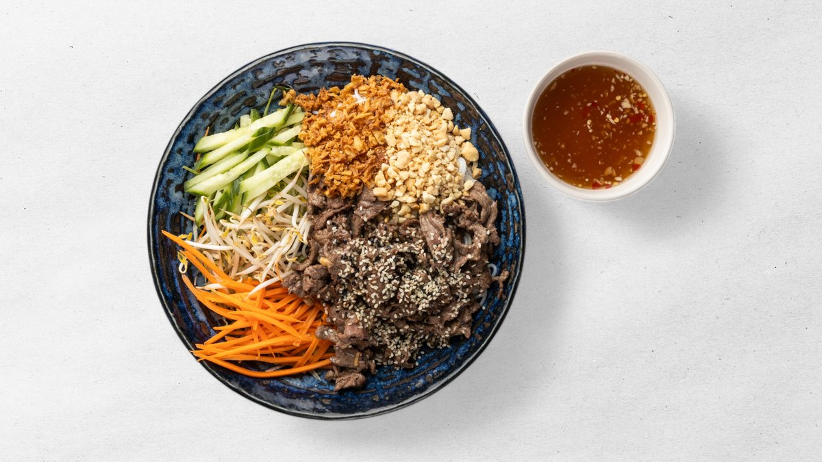 restované hovězí, rýžové nudle bun, ledový salát, okurka, mrkev, sojové klíčky arašídy, smažená cibulka, sezam, rybí sladkokyselá omáčka