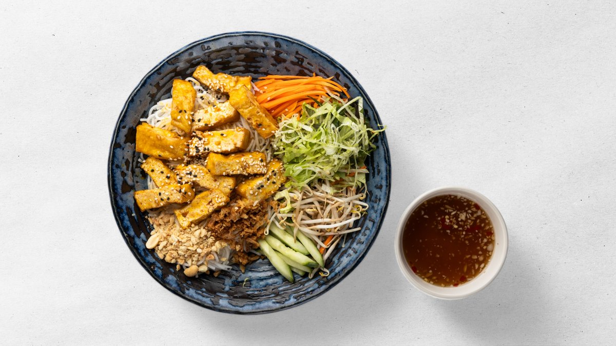 rýžové nudle bun, ledový salát, okurka, mrkev sojové klíčky, arašídy, smažená cibulka, sezam, tofu, rybí sladkokyselá omáčka