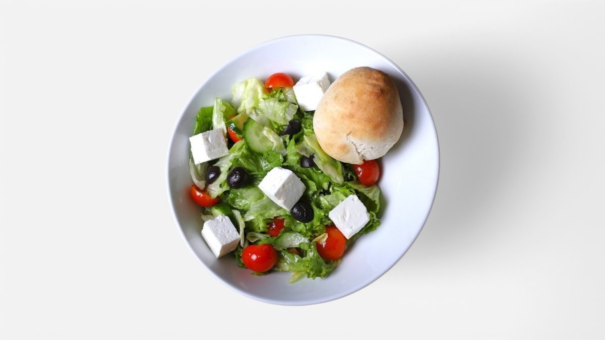okurky, rajčata, sýr feta, červená cibule, olivy, olivový olej, chléb, 400g