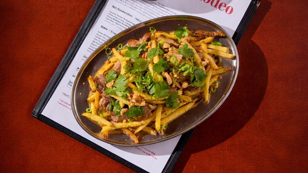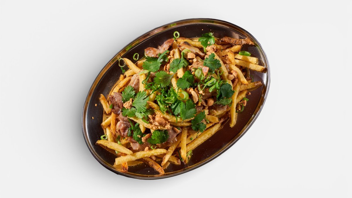Křupavé hranolky s Massaman curry omáčkou, kuřecím masem, sýrem, praženými arašídy, jarní cibulkou a koriandrem