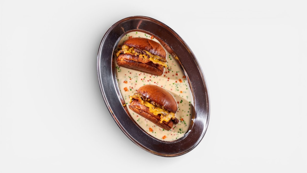 Dvojitý cheeseburger z Čestru, beurre blanc omáčka, kaviár, pažitka