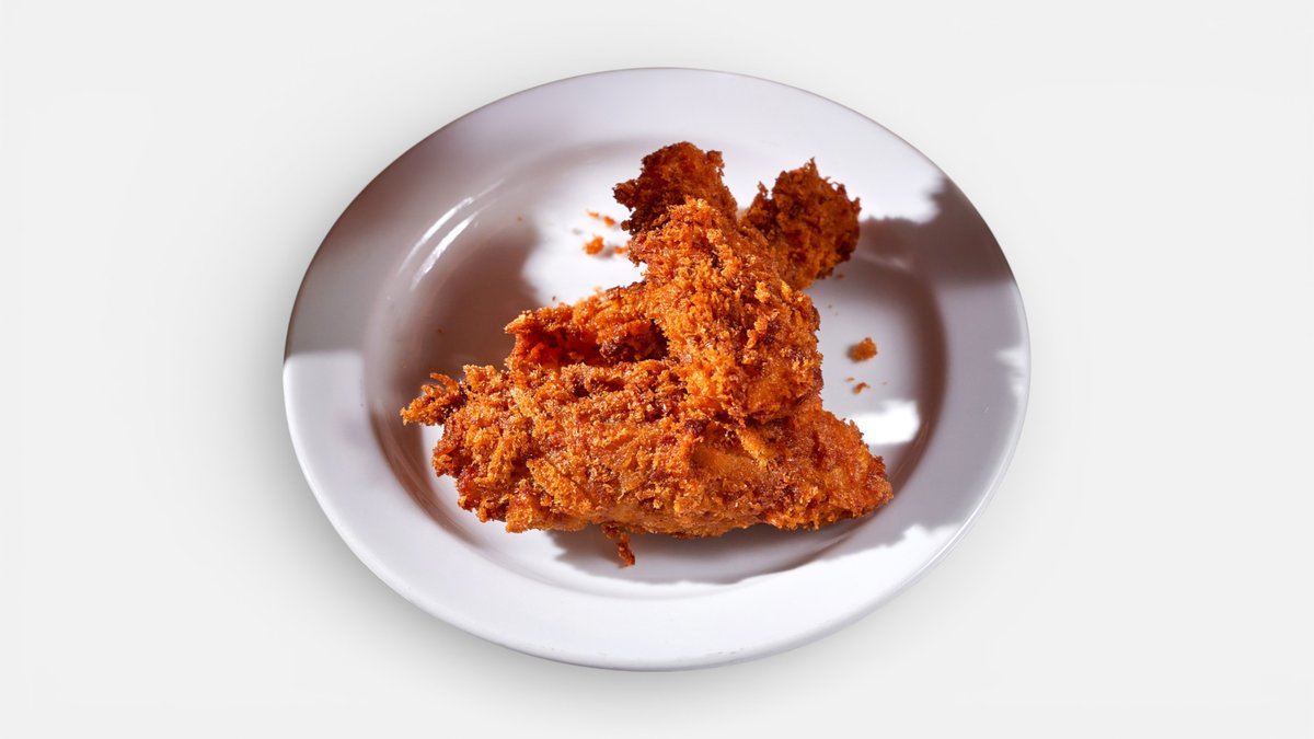 Pálivé smažené kuřecí stehýnko, toastový chleba, chili olej, cibule, okurka, majonéza