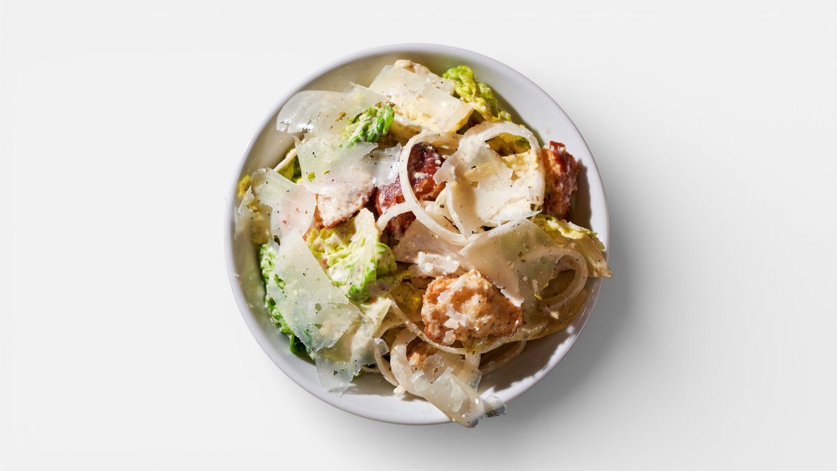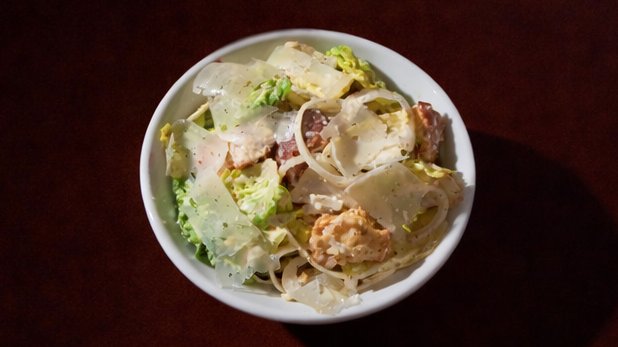 Listový salát, dressing z nakládaného pepře, cibule, krutony , parmazán
