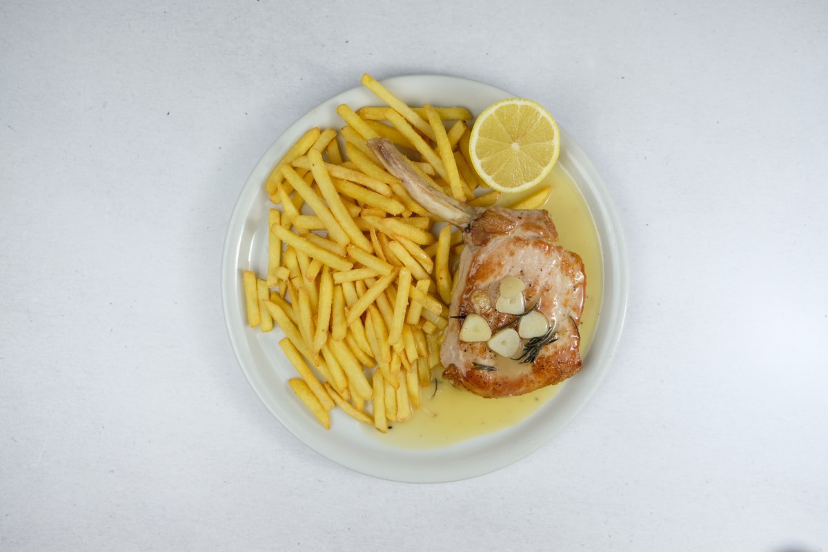 t-bone vepřový steak na pánvi s česnekem, rozmarýnem a bílým vínem, hranolky