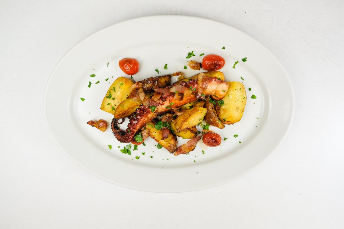 al forno grilovaná chobotnice s bramborem a kousky guanciale