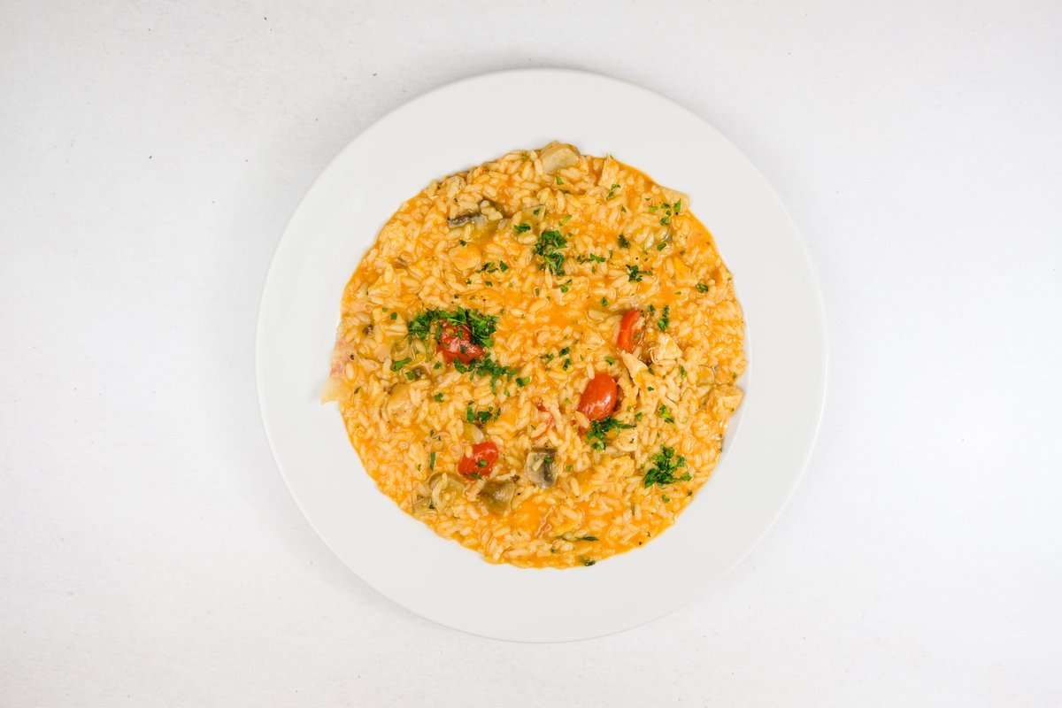 arborio rýže s kuřecím masem, houbami, sladkou cibulkou, slaninou, cherry rajčaty