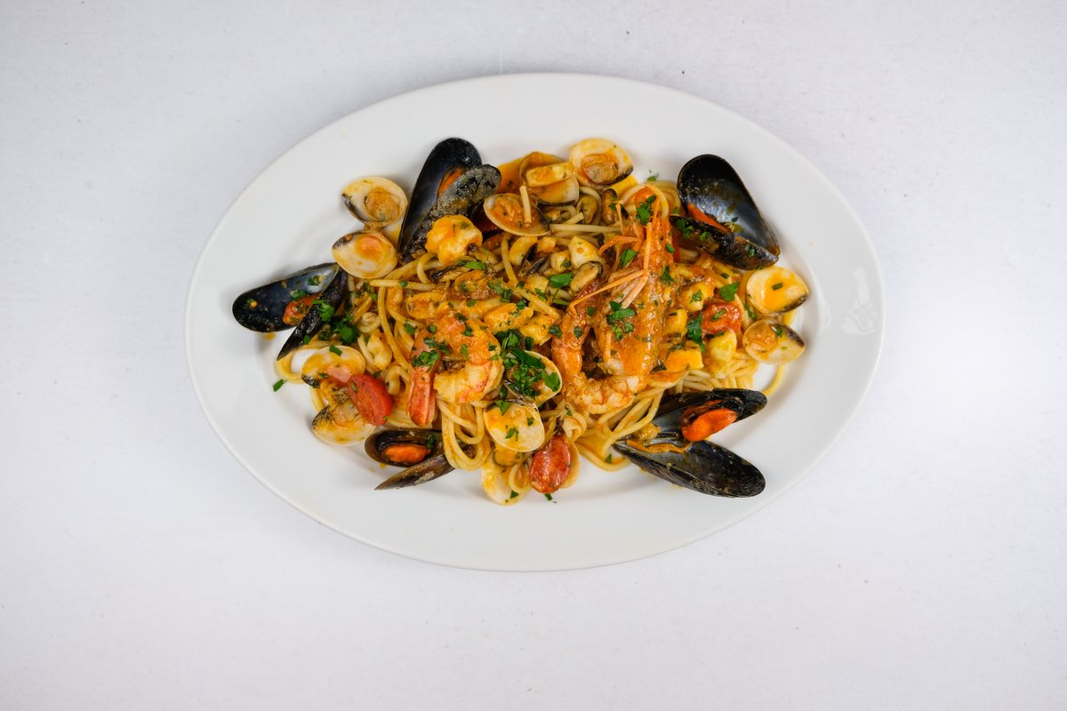 olivový olej, česnek, cherry rajčaty, mix mořských plodů