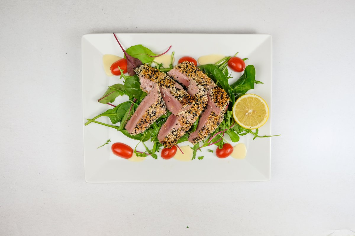 grilovaný steak z tuňáka s míchaným salátem a cherry rajčaty