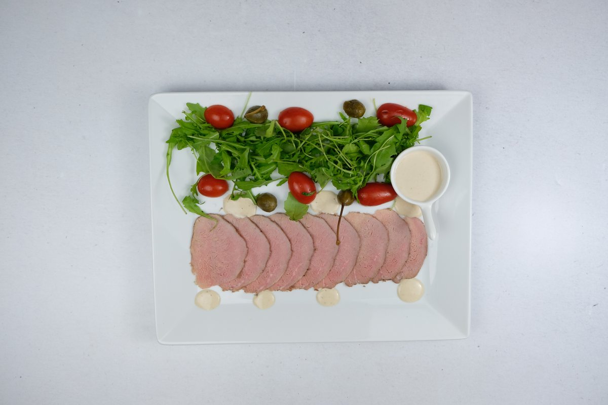 plátky telecího masa podávané s lehkou tuňákovou omáčkou, kapary, ančovičkami a rukolou