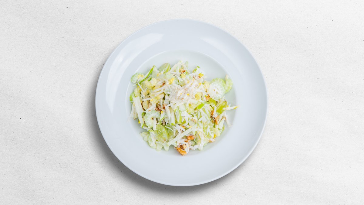 WALDORF SALÁT Z KYSELÝCH JABLEK, VLAŠSKÝCH OŘECHŮ, HROZNOVÉHO VÍNA A CELERU, MAJONÉZA S JOGURTEM