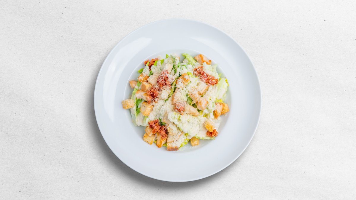 CÉZAR S GRILOVANÝM KOŘENĚNÝM KUŘECÍM PRSEM, SALÁTEM LITTLE GEM, SLANINOU, CHLEBOVÝMI KRUTÓNY, PARMAZÁNEM A ANČOVIČKOVÝM DRESINKEM