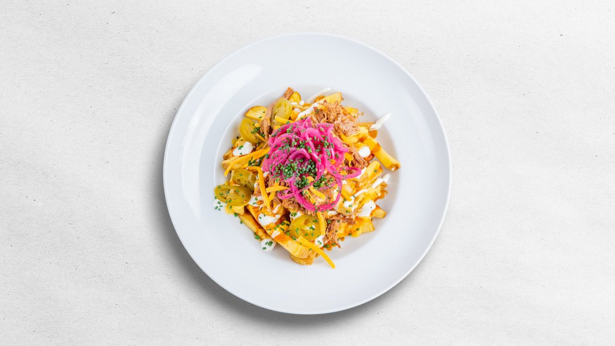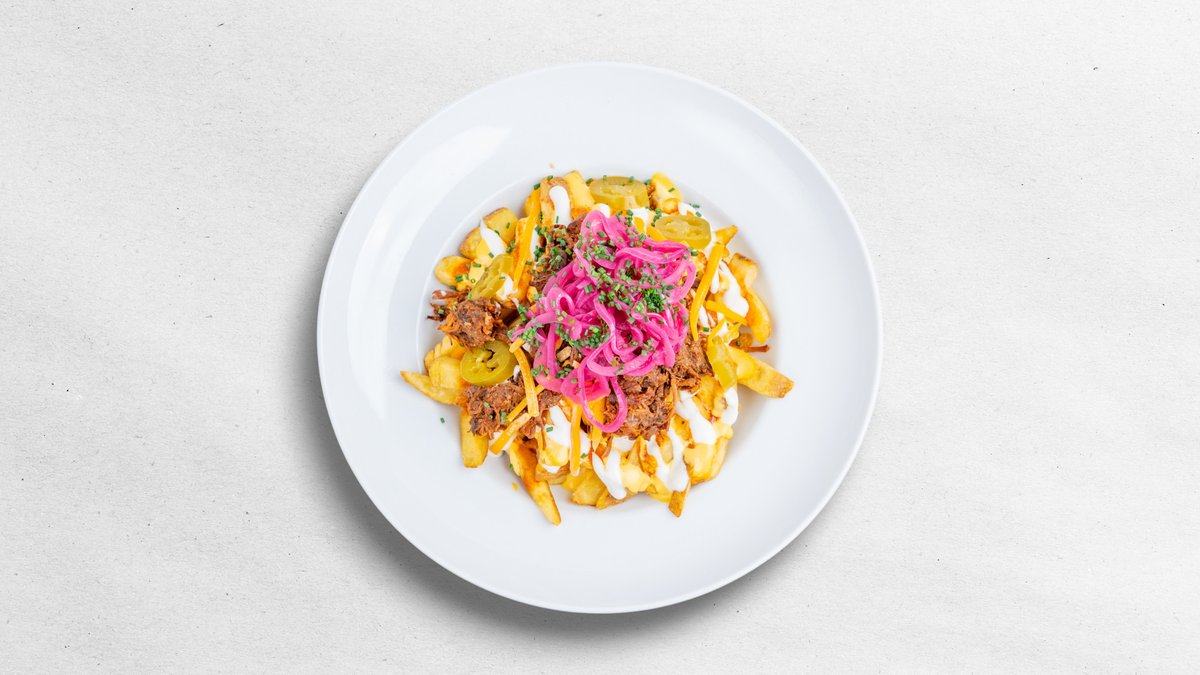 PODÁVANÁ NA BRAMBOROVÝCH HRANOLKÁCH S TEKUTÝM A STROUHANÝM CHEDDAREM, BBQ OMÁČKOU Z VÝPEKU, JALAPEŇOS PAPRIČKAMI, ZAKYSANOU SMETANOU, NAKLÁDANOU ČERVENOU CIBULÍ V MALINOVÉM OCTU A PAŽITKOU