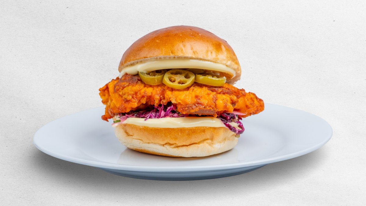 KUŘECÍ PRSO MARINOVANÉ V KOŘENÍ A KEFÍRU, SMAŽENÉ V CHILLI OLEJI A KOŘENÍ, NÁŠ COLESLAW S WASABI A KORIANDREM, JALAPENOS PAPRIČKY, MAJONÉZA, HLADKÁ BRIOŠKA