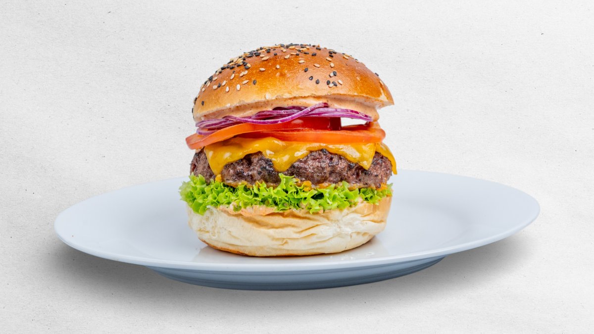 MLETÝ HOVĚZÍ KRK, SÝR CHEDDAR, MASITÁ RAJČATA, ČERVENÁ CIBULE, KŘUPAVÝ SALÁT, NAŠE SEVEN 7 OMÁČKA, SEZAMOVÁ BRIOŠKA