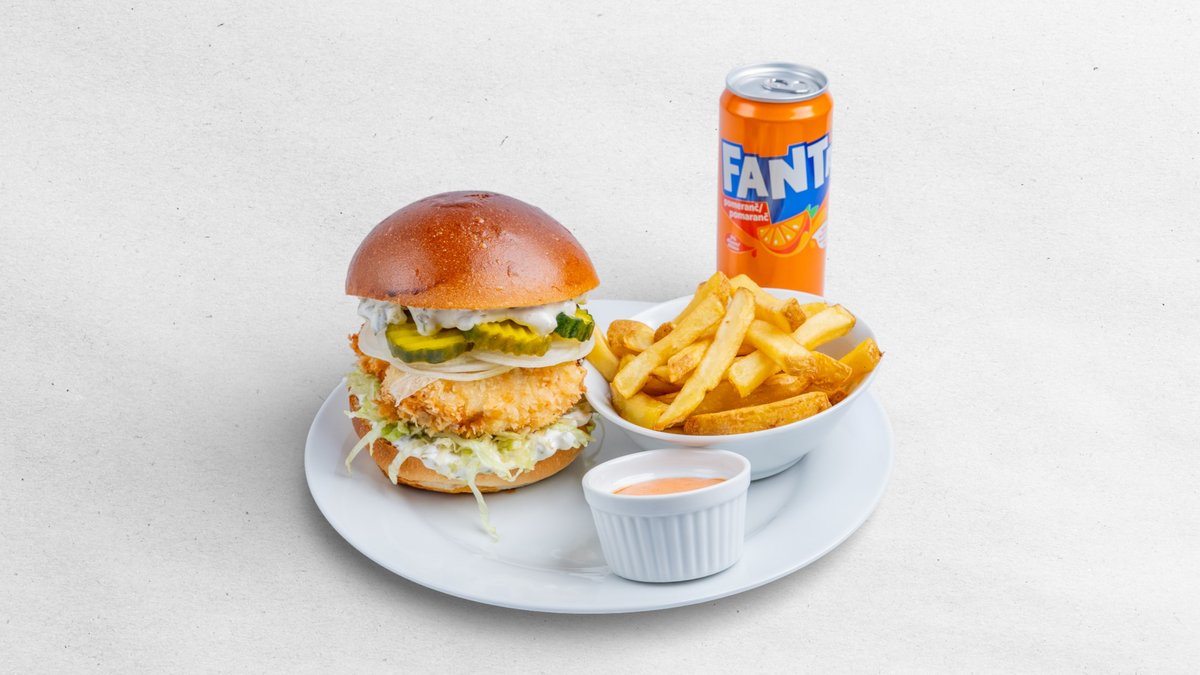 KUŘECÍ PRSO MARINOVANÉ V KEFÍRU A SMAŽENÉ V PANKO STROUHANCE, CIBULE, NAKLÁDANÉ OKURKY S KARI KOŘENÍM A HOŘČIČNÝM SEMÍNKEM, LEDOVÝ SALÁT, KAPAROVO OKURKOVÁ MAJONÉZA, HLADKÁ BRIOŠKA