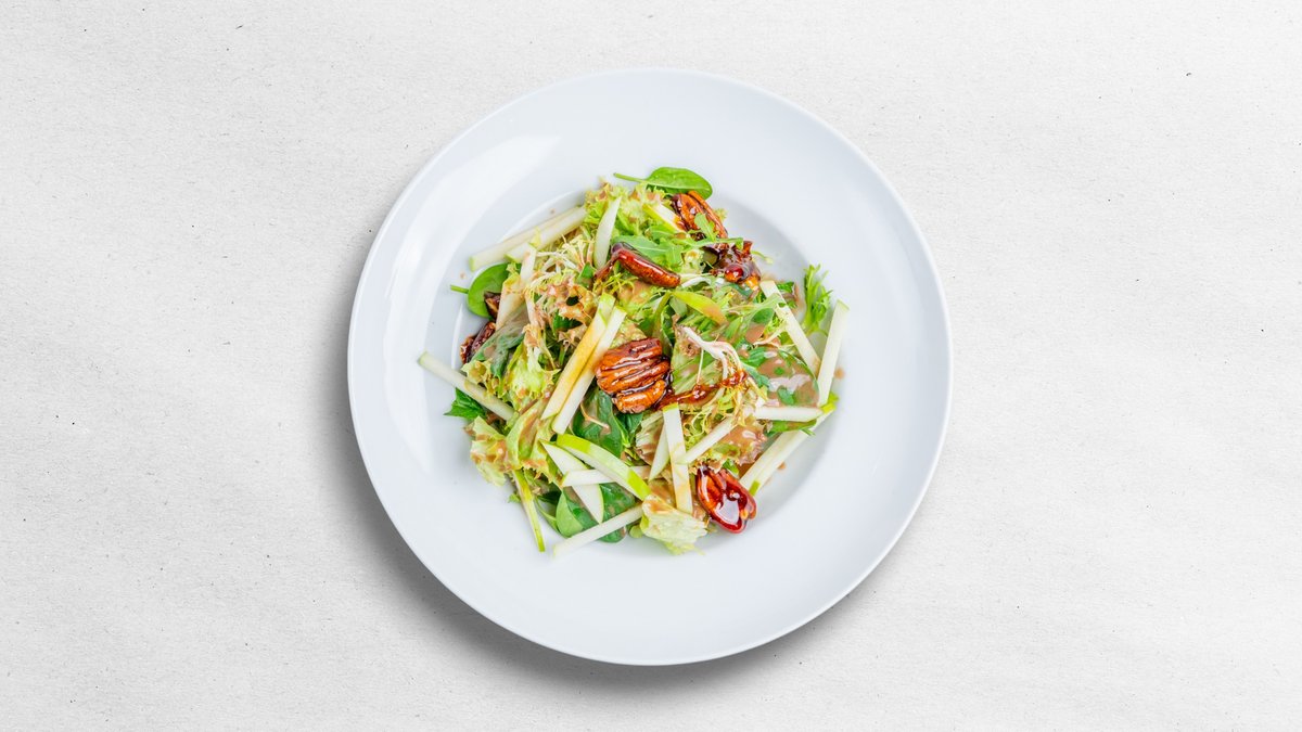 TRHANÉ LISTOVÉ SALÁTY S JABLKY GRANNY SMITH A PEKANOVÝMI OŘECHY V KARAMELU, DRESINK Z PORTSKÉHO VÍNA