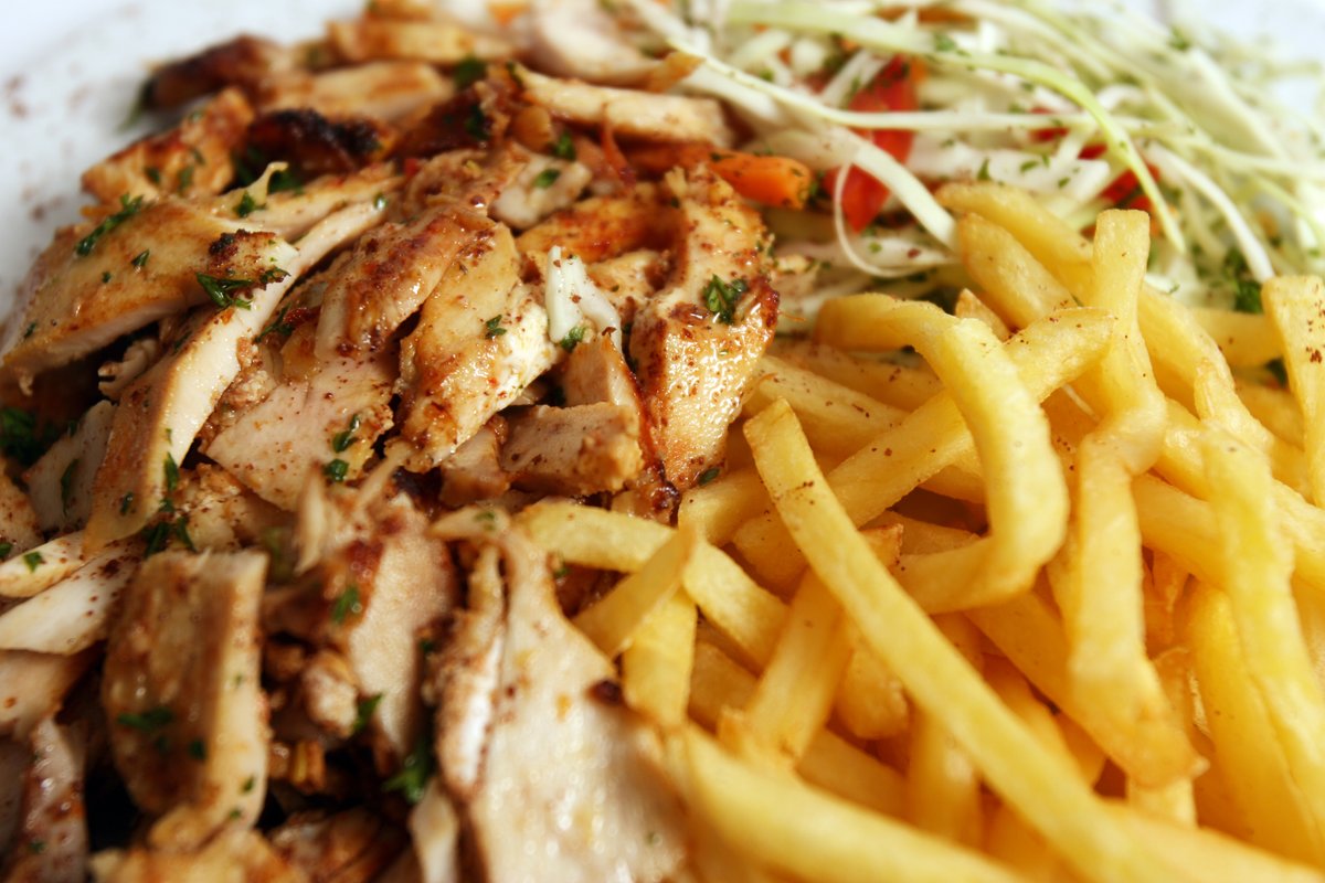 Ochutnej naši neodolatelnou shawarmu, plnou šťavnatého masa a koření. K tomu si vychutnej křupavý zelný salát, zlatavé hranolky a dresink dle tvého výběru. Tento lahodný pokrm tě přenese rovnou do srdce Blízkého východu.