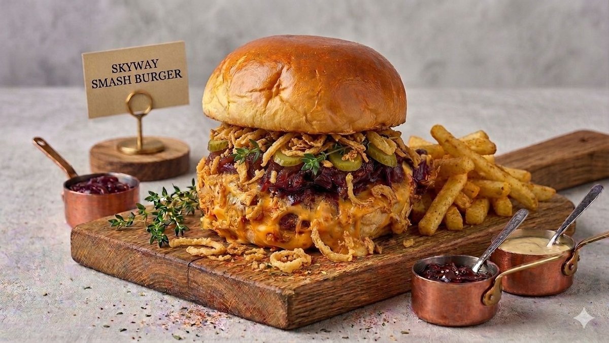 Máslová bulka, porce vyzrálého hovězího maso s Iberijským špekem, plátek irského chedaru, cibulová marmeláda, nakládaná okurka, smažená cibulka, Skyway majonéza.