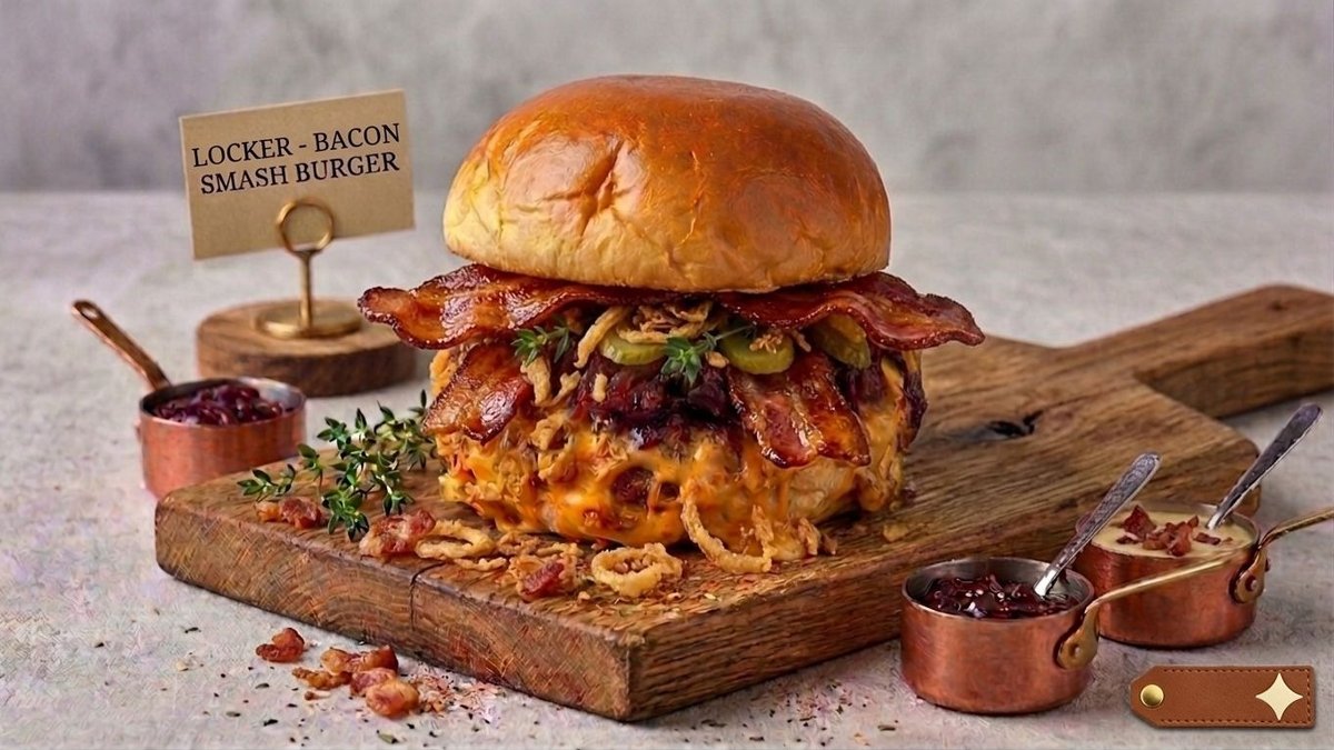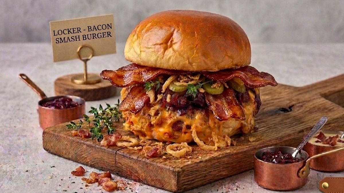 Máslová bulka, porce vyzrálého hovězího maso s Iberijským špekem, pořádná porce slaniny, plátek irského chedaru, cibulová marmeláda, nakládaná okurka, smažená cibulka, Skyway majonéza.