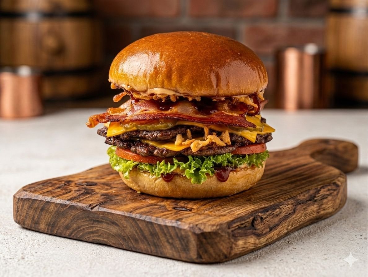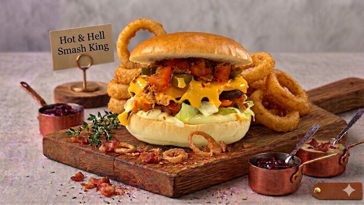 Máslová bulka, porce vyzrálého hovězího masa s Iberijským špekem, jalapeño papričky, plátek irského chedaru, pikantní rajčatová salsa, smažená cibulka, pikantní majonéza.