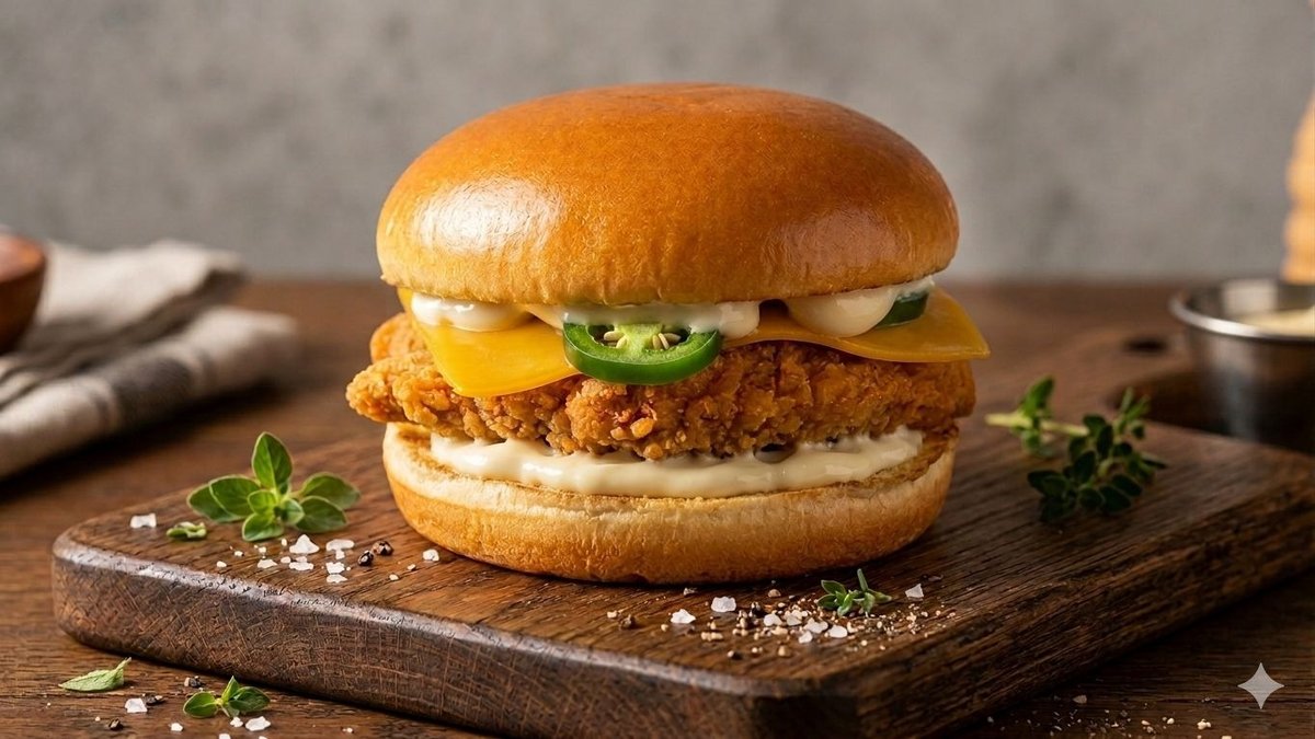 smažená kuřecí prsíčka v křupavé panádě složené v máslové bulce na plátky krájené jalapeño papričky, čedar a jemná majonéza