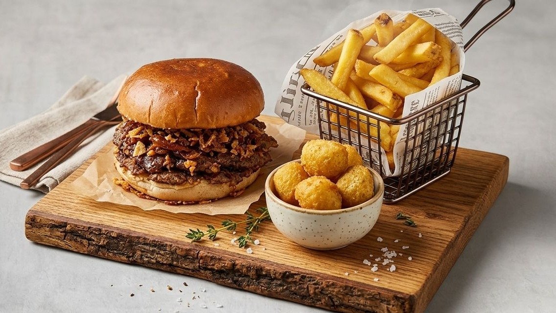 náš smash burger doplněný o porci hranolek, 5 kusů smažených nugetek s jalaneňo papričkou 💙