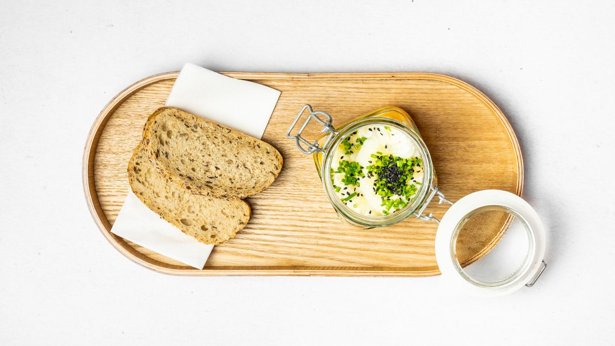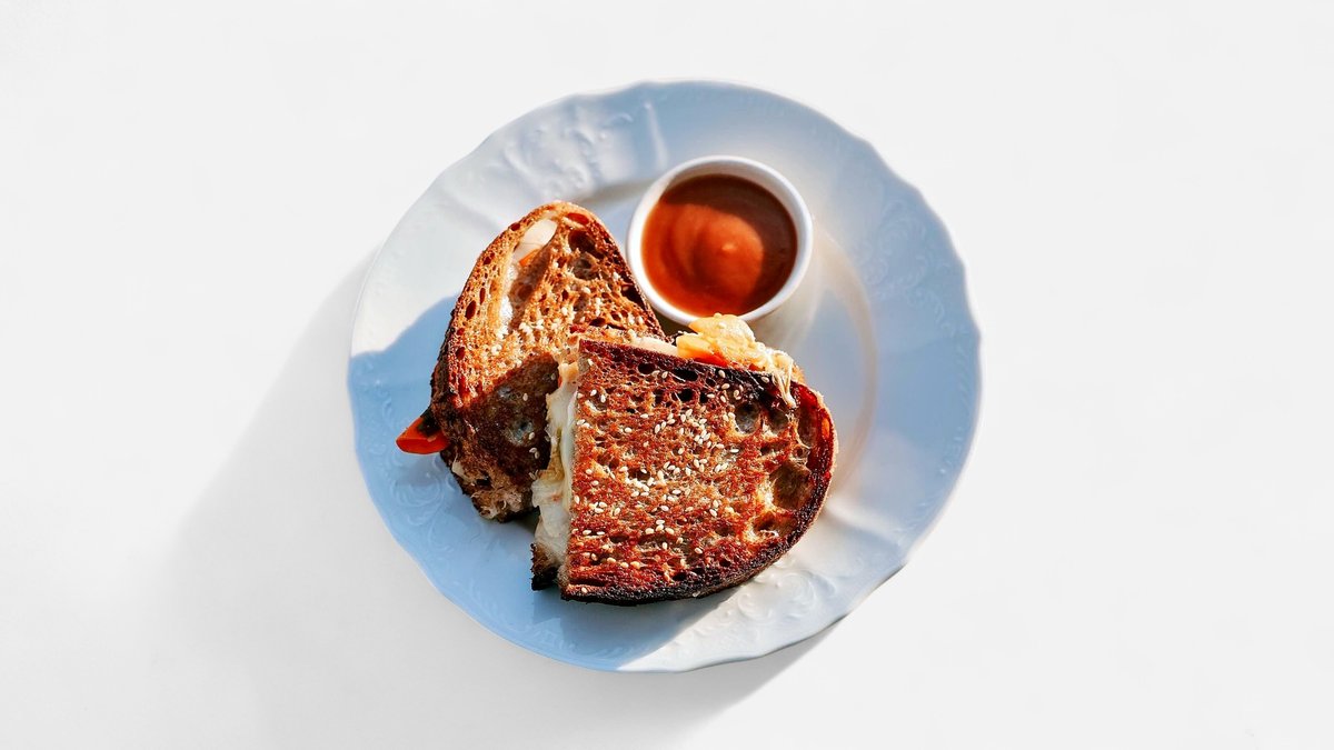 Zapečený chléb s kimchi a vyzrálým sýrem, jablečný kečup