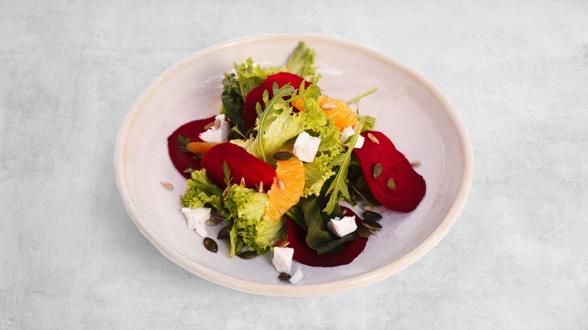 CZ/ Kozí Sýr, Carpaccio z Červené Řepy, Pomeranč, Baby Špenát, Rukola, Listy Salátu, Citronová Šťáva, Medovo-Dijonská Omáčka s Olivovým olejem, Sezam, Dýňová a Slunečnicová Semínka. EN/ Goat Cheese, Beetroot Carpaccio, Orange, Baby Spinach, Rocket, Salad Leaves, Lemon Juice, Honey-Dijon Sauce with Olive Oil, Sesame, Pumpkin and Sunflower Seeds