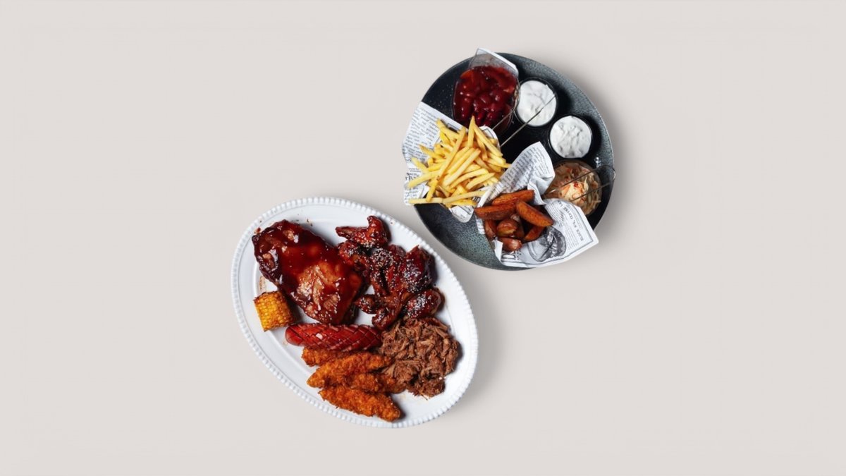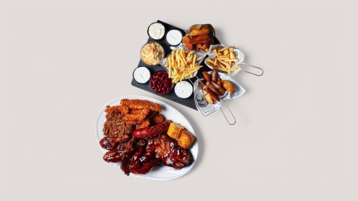 2 ks BBQ kuřecí paličky, 4 ks sweet chilli křídla, 4 ks kuřecích stripsů, 650 g BBQ vepřová žebírka, 200 g trhané plece, 100 g grilovaná pikantní klobása 1 x hranolky, 1 x americké brambory, 1 x chilli fazole, 1 x coleslaw, 2 x kukuřice, 2 x omáčka dle výběru