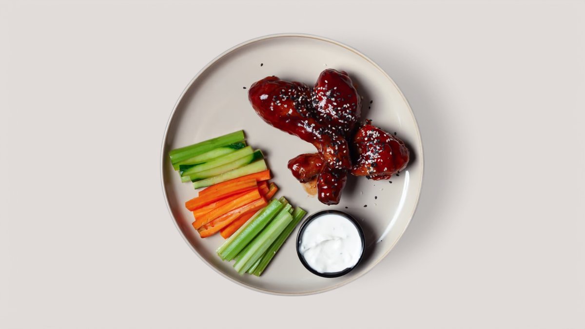 kuřecí paličky v pikantní omáčce s cayennským pepřem, s crudité zeleninou a bylinkovým dipem