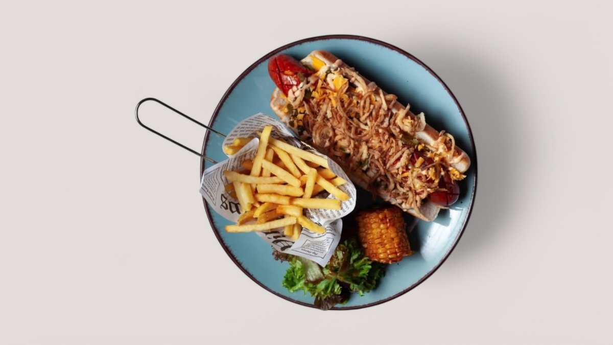 grilovaná pikantní klobása, mix salátů, jalapeňos, majonéza, smažená cibulka, cheddarová omáčka kukuřice, hranolky