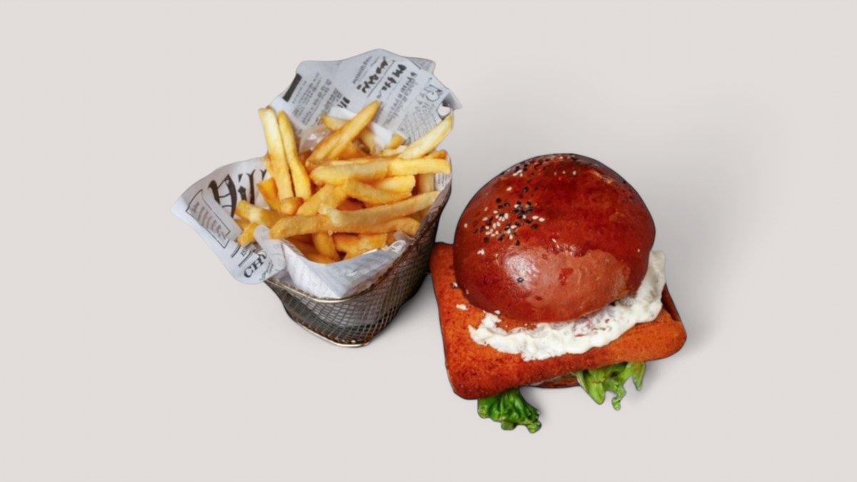 180 g křupavého kuřecího prsa obaleného v kukuřičných lupínkách v máslové briošce se slaninou, sýrem gouda, červenou cibulí, chipotle majonézou, listovým salátem a rajčaty, hranolky