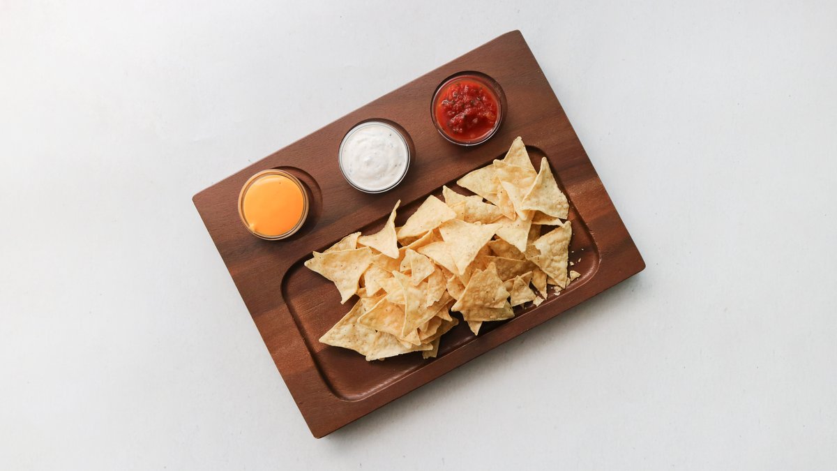 smažené kukuřičné tortillové chipsy se zakysanou smetanou s česnekem a bylinkami, teplým tekutým čedarem a pikantní rajčatovou salsou. (1,7)