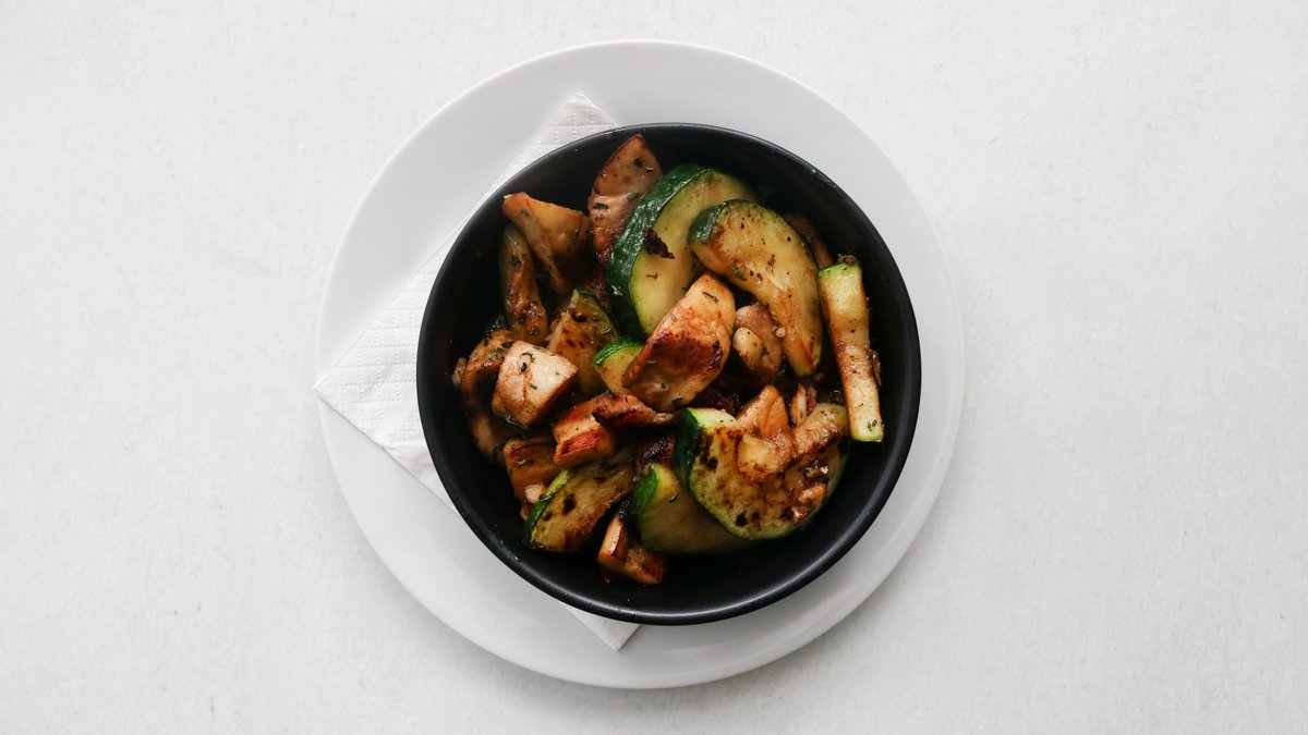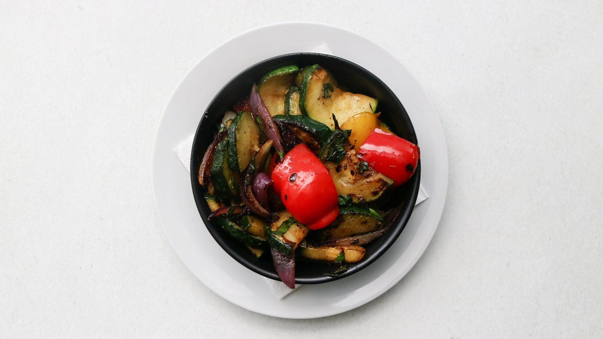 červená a žlutá paprika, cuketa, cibule, čerstvá bazalka, olivový olej