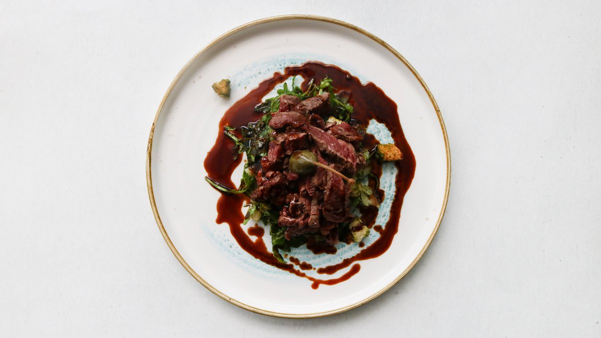hovězí svíčková, hořčice dijon, majonéza, worcester kapary, okurky, cibule, lanýžový olej, rukola, tousty (1,3,7,10)