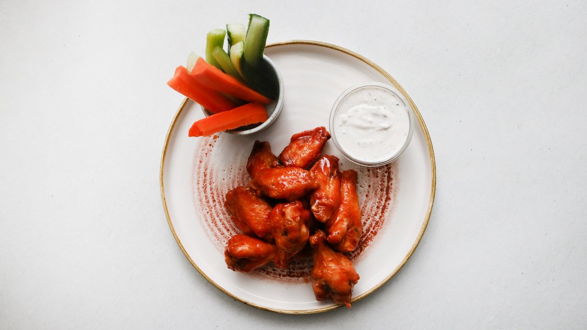 buffalo / Sweet & Chilli / BBQ se zeleninovým Crudités a omáčkou z modrého sýra nebo se zakysanou smetanou s česnekem a bylinkami (1,3,7,9,10,12)