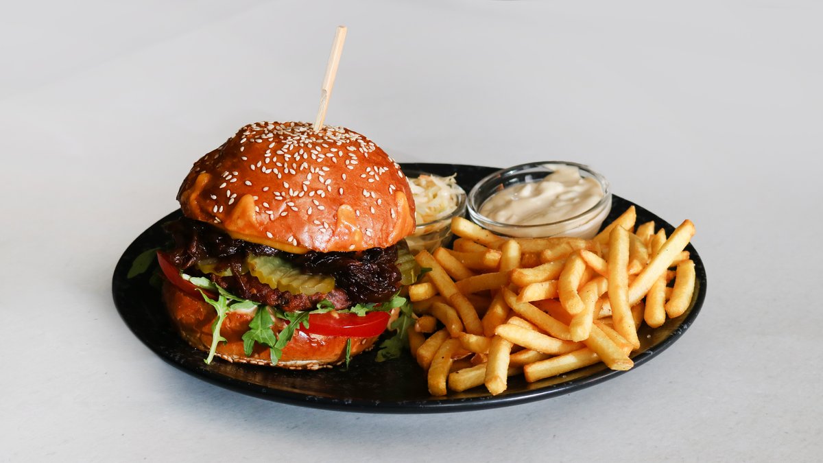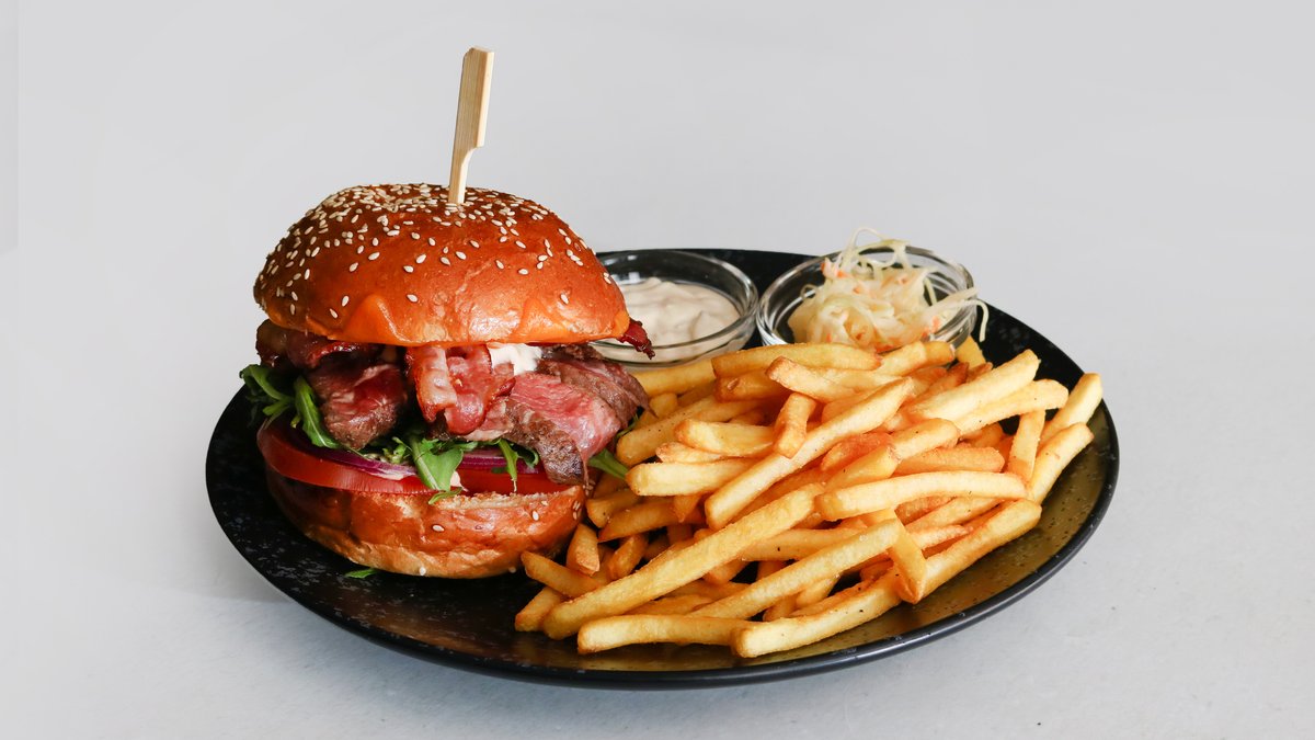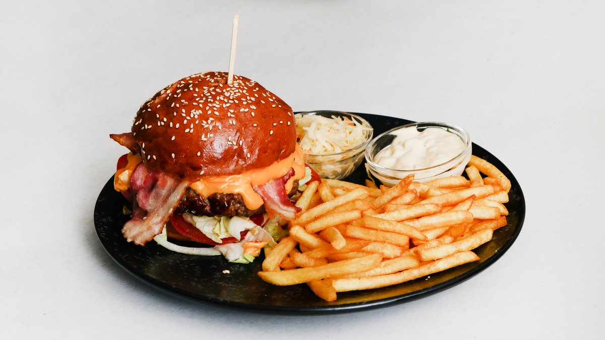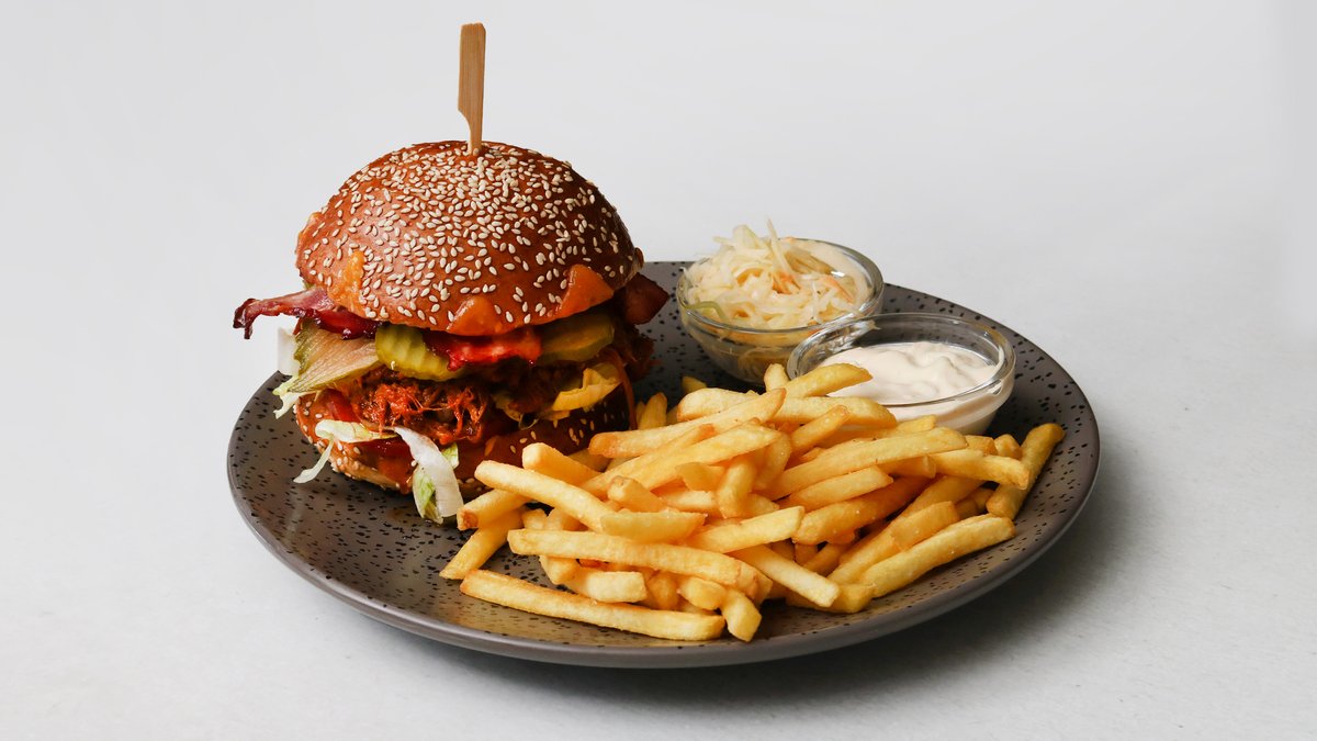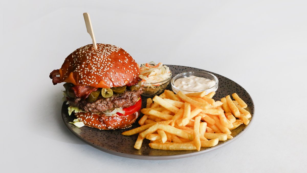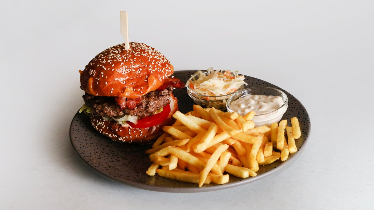 Ke každému burgeru jsou podávány hranolky, coleslaw salátek a domácí tatarská omáčka.