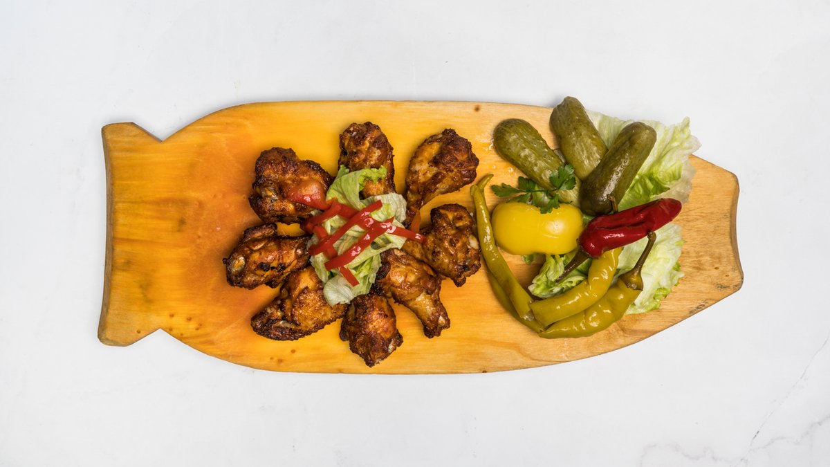 400g Marinováná pečená kuřecí křídla, americký brambor, coleslaw salát