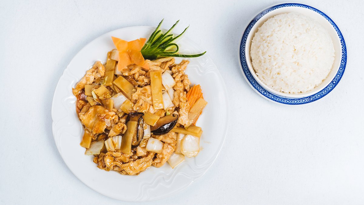 M23. Kuře s bambusem a houbami s rýži
