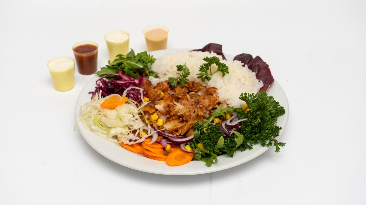 kuřecí maso, fritovaná zelenina, salát, nakládané okurky, dresink, hummus/baba ganuž, hranolky/chléb/rýže