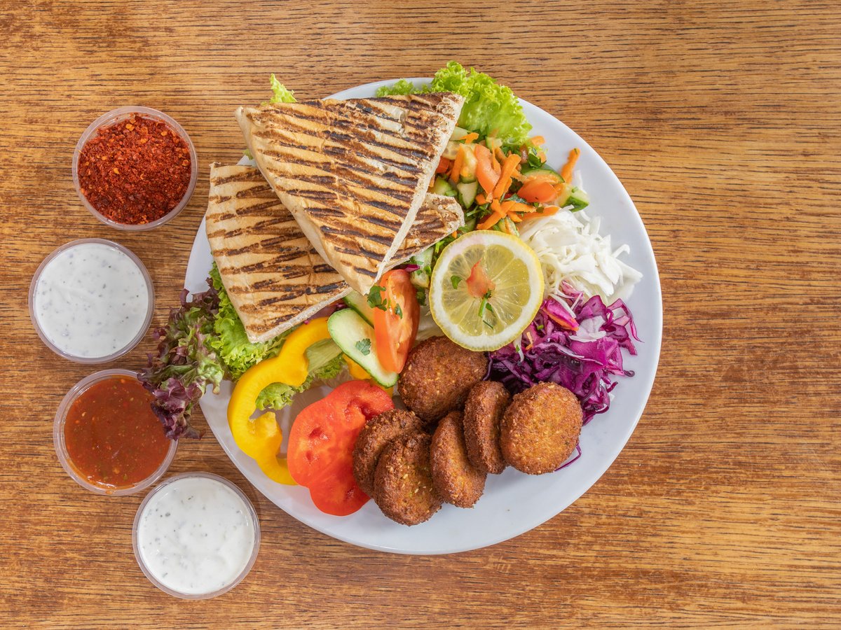 falafel, fritovaná zelenina, salát, nakládané okurky, dresink, hummus/baba ganuž/ hranolky/chléb/rýže