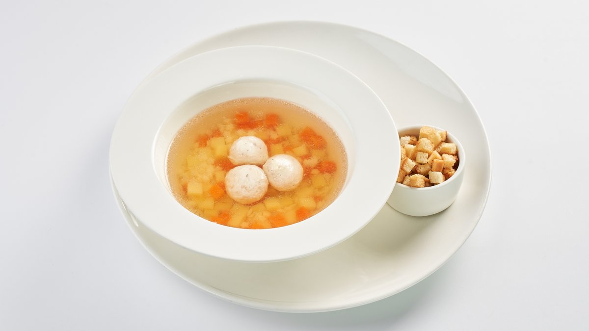 kuřecí vývar, kuřecí masové kuličky, mrkev, brambory, těstoviny, krutony 300/15 g