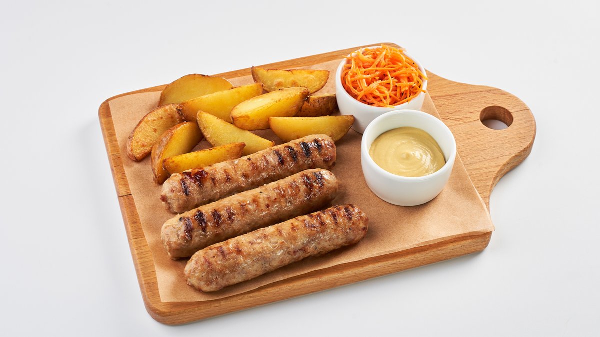 grilované klobásy, americké brambory, korejská mrkev, dijonská hořčice 250/130/30 g